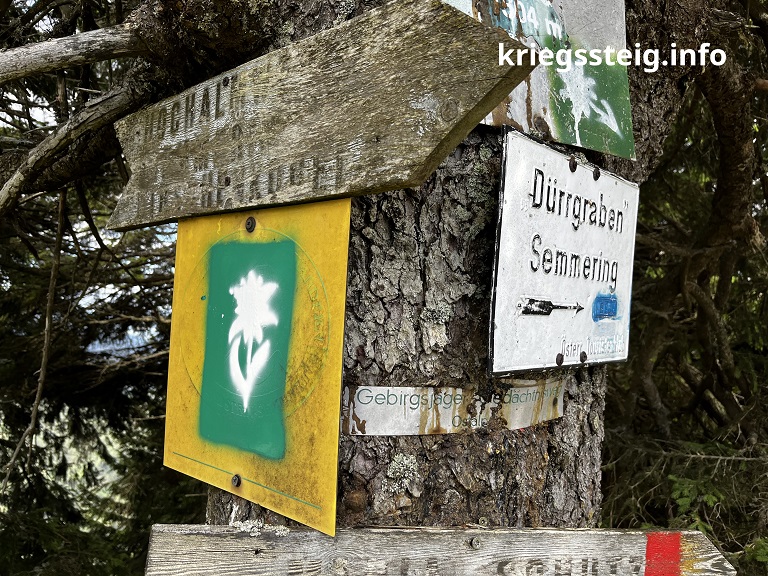 Auch der Dürrsattel war heiß umkämpft, da die Rote Armee in den Dürrgraben und weiter in die Steiermark vordringen wollte. Ein Wegweiser markiert den Weg hinab in den Dürrgraben. Interessierte können ihm ein Stück folgen und deutsche Granatwerferstellungen finden.