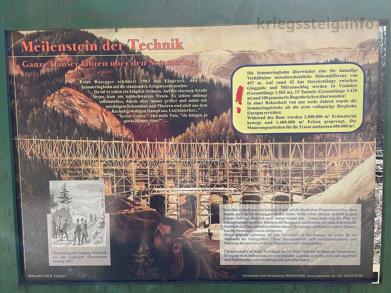 Danach halten wir uns rechts und folgen der Straße parallel zur Eisenbahnlinie, vorbei an einer Informationstafel zum Bau der Semmeringbahn. Recht bald (bei einem Marterl) zweigen wir links ab und gehen immer den markierten Weg weiter bis zum Gasthaus „Polleres“ auf dem Kreuzberg. Vom Adlitzgraben bis zum Gasthaus „Polleres“ ist der Weg auch durchgehend markiert.