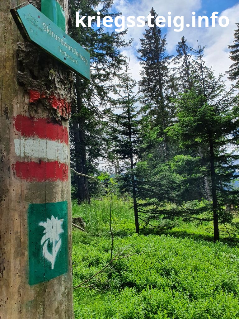 Auf der Hauptstraße gehen wir nach links zum großen Schwarzaviadukt der Semmeringbahn, wo auch die Front verlief. Kurz nach dem Viadukt war eine Panzersperre aufgebaut, während Payerbach selbst bereits in russischer Hand war. Unmittelbar nach dem Schwarzaviadukt zweigt der „Schneedörflweg“ nach rechts ab, dem wir folgen. Auf dieser kleinen Straße gehen wir jetzt immer bergauf, die Museumsbahn Payerbach – Hirschwang querend bis nach Schneedörfl. Wo unser Weg an die „Schneedörflstraße“ anstößt, folgen wir der Markierung, die zum „Friedrich Haller Haus“ führt, nach links zu einer kleinen Kapelle. Hier hat früher eine Tafel an den Stellungskrieg um das Schneedörfl von 4. bis 8. Mai 1945 erinnert. Wir verlassen die Straße und folgen dem Edelweiß. Nach einem Forsthaus halten wir uns Richtung Waldburg-Anger Hütte.
